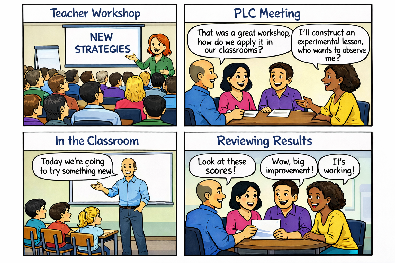 What distinguishes this model is its structured use of action research, embedded directly into Professional Learning Community (PLC) leadership. Teachers engage in systematic inquiry into their own classrooms, using real data to identify student learning needs, test instructional strategies, and measure impact. This process is both rigorous and empowering.